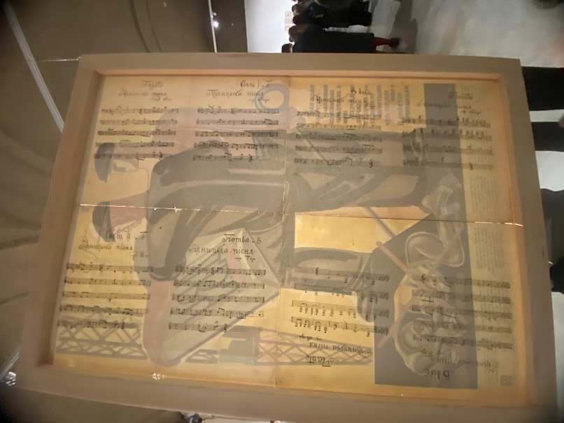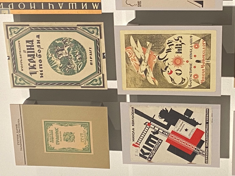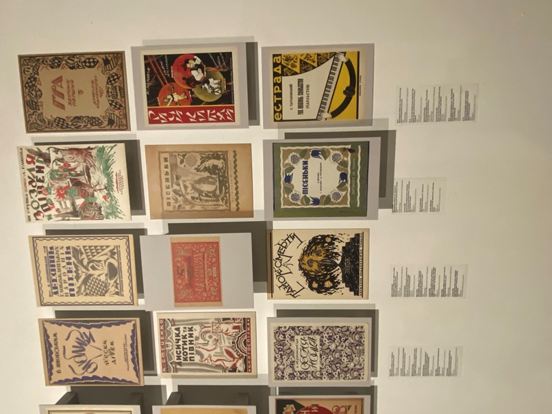 Прикметно, що одним з активних партнерів виставки є й наша бібліотека. У залі, де представлені книжкові обкладинки, цілий стенд присвячено обкладинкам нотних видань, які надані для експозиції відділом музичних фондів НБУВ. Цікавим окремим нашим експонатом є ще й оригінал великого агітаційного плаката Харківського державного видавництва авторства художника Д.М. Шавикіна із зображенням двох робітників, котрі дивляться відкриту книгу, а вірш під зображенням наполегливо закликає здобувати знання і звертатись до книг. Особливим акцентом цього плаката є те, що на його звороті вміщено ноти «Гірницької пісні» композитора М.Д Тіца.