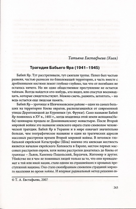 ЕвстафьеваТ. Трагедия Бабьего Яра (1941 – 1945) //Друга світова війна і доля народів України: Матеріали 2-ї Всеукраїнської наукової конференції м. Київ, 30-31 жовтня 2006 р. – К.: Зовнішторгвидав, 2007. – С.263-278. – 2008. 606-8