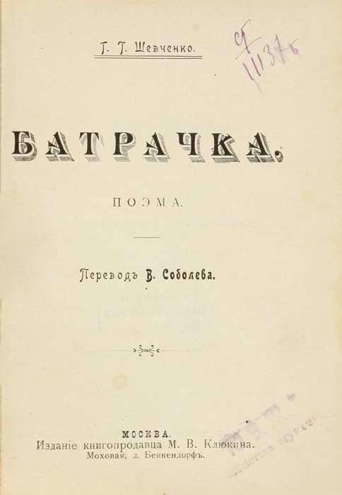 Шевченко Т. Г. Батрачка : Поэма / пер. В. Соболева. – М., [1905]. – 32 с.