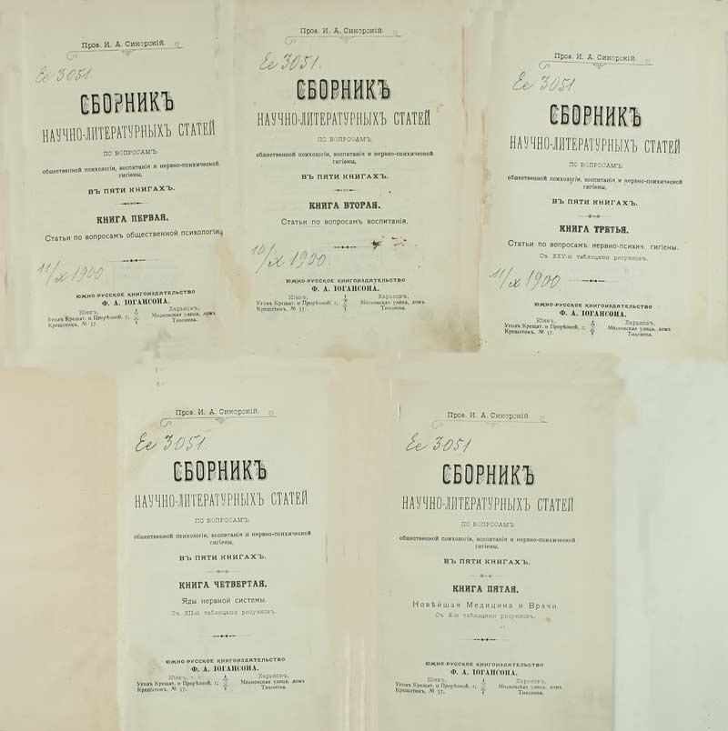 У список включена праця І.О. Сікорського “Сборникъ Научно-Литературныхъ трудовъ” з запропонованого читачеві видання у п’яти книгах. У деяких випадках описуються невеликі за обсягом праці, статті з періодичних видань, тощо.