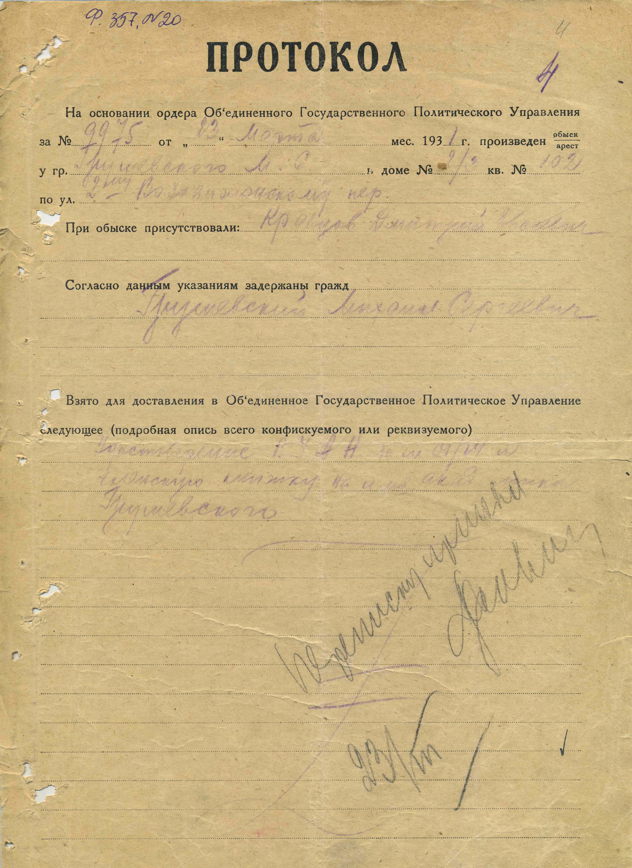 Особовий фонд М. С. Грушевського (Ф. 357) налічує 78 од. зб. Додаткові матеріали, що відображають життєвий, суспільно-політичний та науковий шлях видатного вченого містяться також у фондах Української Академії Наук (Ф. Х), «Літературні матеріали» (Ф. І). Серед експонатів електронної виставки: біографічні матеріали (особові справи та формулярні списки, фотографії, рахункова книга, документи про переслідування М. С. Грушевського радянською владою, посмертну реабілітацію, історія хвороби та смерті); документи, що відображаються наукову та громадську діяльність (статті, промови, нариси, рецензії); епістолярна спадщина вченого (офіційні листи, телеграми, привітання).