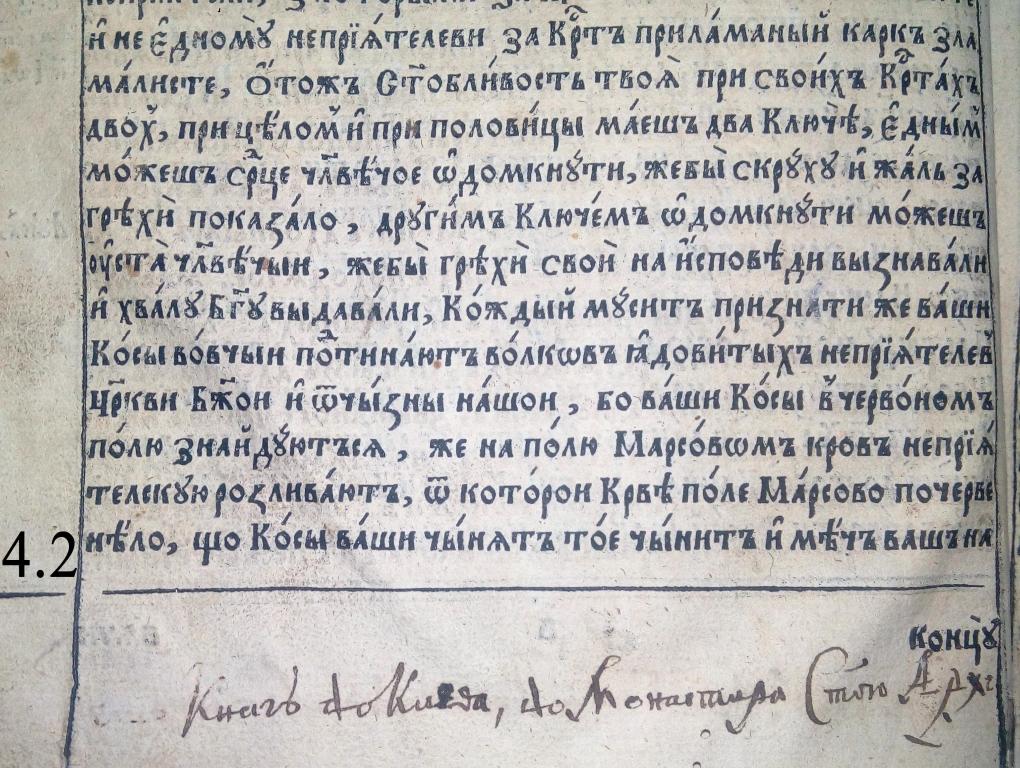 У примірнику 1665 р. «Ключа разумінія» Кир.2572п також є поаркушний запис Й. Ґалятовського, стилістично майже ідентичний із записом попереднього примірника, однак з зазначенням вкладу книги до Київського Пустинно-Микільського монастиря (іл. 4.1-4.9) [1, С. 76, № 92]. Далі одразу ж після цього запису його продовжує наступний, аналогічний вміщеному в попередній книзі, про привезення зі Львова до Києва міщанином М. Морозовичем, частково заклеєний.