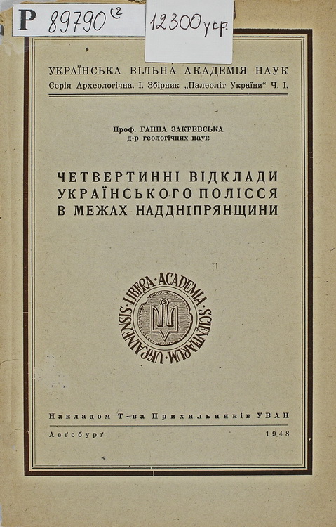 2. Закревська Г. Четвертинні відклади Українського Полісся в межах Наддніпрянщини / Ганна Закревська. – Авгсбург, 1948. – 29 с. – (Серія Археологічна. 1. збірник «Палеоліт України» / Українська Вільна Академія Наук; Ч. 1).