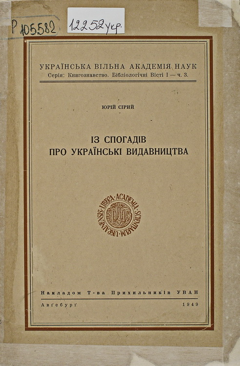 10.Сірий (Тищенко) Ю. Із спогадів про українські видавництва / Юрій Сірий (Тищенко). – Авгсбург : Товариство прихильників УВАН, 1949, 12 с. (Серія: Книгознавство. Бібліологічні вісті І – ч. 3 / Українська вільна академія наук).