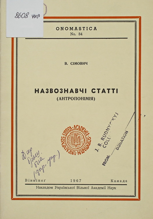 27. Скоробогата Є. Власні імена й загальні назви грецького походження в «Метаморфозах» Овідія / Є. Скоробогата. – вид. 2. – Вінніпег: Накладом УВАН, 1966. – 16 с. – (Onomastica=Назвознавство / УВАН; Ч. 32 ).