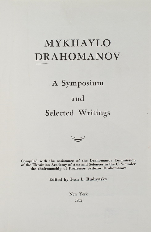 38. Mykhaylo Drahomanov. A Symposium and Selected Writings / Compiled with the assistance of the Drahomanov Commission of the Ukrainian Academy of Arts and Sciences in the U. S. under the chairmanship of Professor Svitizor Drahomanov; Edit. by Ivan L. Rudnytsky. – New York, 1952. – 225 c.