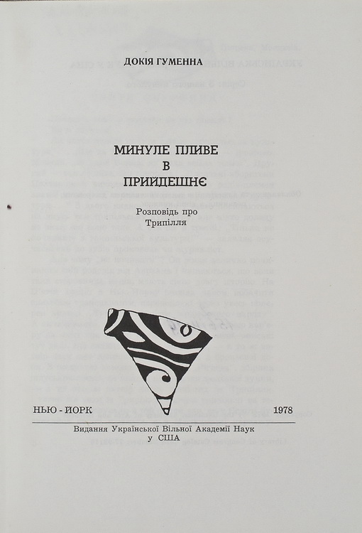 33. Гуменна Д. Минуле пливе в прийдешнє: Розповідь про Трипілля / Докія Гуменна. – Нью-Йорк: Видання Української Вільної Академії наук у США, 1978. – 384 с.: іл. – (Серія: З нашого минулого / Українська вільна академія у США).