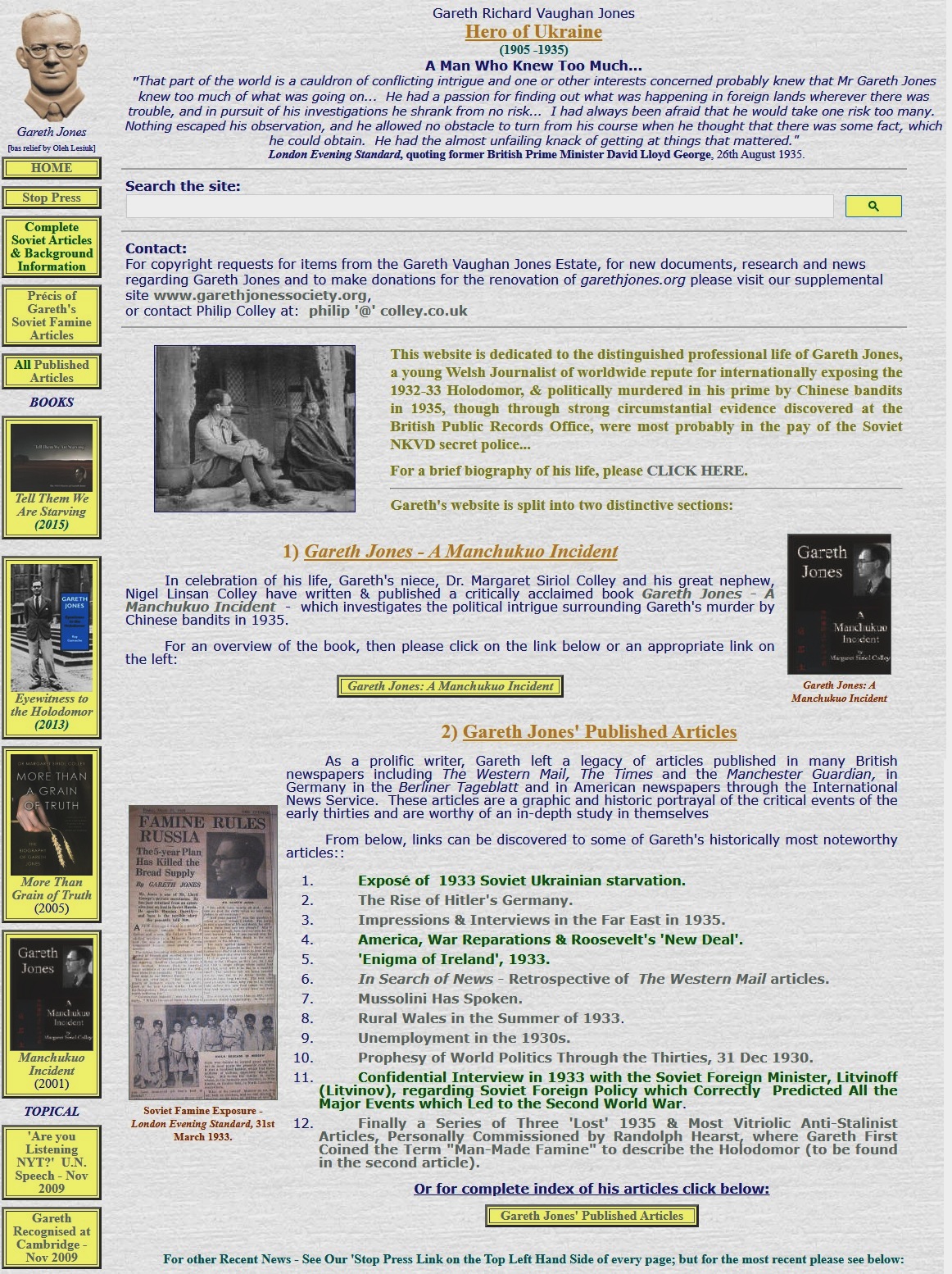 Зі змісту: Colley M. S. Gareth Jones: A Manchukuo Incident / Margaret Siriol Colley. Newark, 2001. 290 p. – URL: https://www.garethjones.org/manchukuo_incident/index.htm; Gareth Jones’ Newspaper Articles from 1930–35. – URL: https://www.garethjones.org/published_articles/published_articles.htm (Soviet Articles; German Articles; American Articles; Irish Articles; Far East Articles; War on Unemployment & 1933 World Conference; Rural Wales; In Search of News).