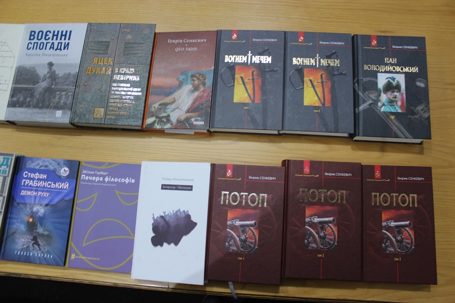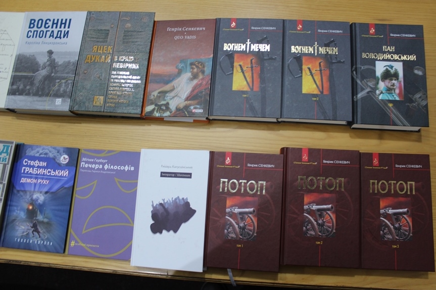 Серед отриманих книг: історичні романи Генріка Сенкевича (1846-1916) «Quo vadis», «Вогнем і мечем», «Потоп», «Пан Володийовський»; п'єса «Печера філософів» польського поета, есеїста і драматург Збіґнєва Герберта (1924-1998); «Печера філософів»; книга «Воєнні спогади. 22 вересня 1939 - 5квітня 1945» відомої польської діячки, історикині і мистецтвознавиці Кароліни Лянцкоронської (1898-2002); «Імператор. Шахіншах» найвидаванішого у світі польського автора, лавреата численних міжнародних премій Ришарда Капусцінського (1932-2007); збірка оповідань жахів «Демон руху» Стефана Грабинського (1887-1936); збірка творів «В краю невірних» відомого сучасного польського письменника-фантаста Яцека Дукая (1974 р. н.) ; «Кордони мрій. Про невизнані республіки» польського репортажиста, письменника, мандрівника та експерта з Центральної та Східної Європи Томаша Гживачевського; «На нелюдські землі» польського художника і письменника Юзефа Чапського (1896-1993); «Демон руху» польськомовного українського за походженням письменника Стефана Грабінського (1887-1936); «Діалоги з совєтами» Станіслава Вінценза (1888-1971); «Кулемети й вишні. Історії про добрих людей з Волині» відомого польського репортера та письменника Вітольда Шабловського (1980 р. н.).
