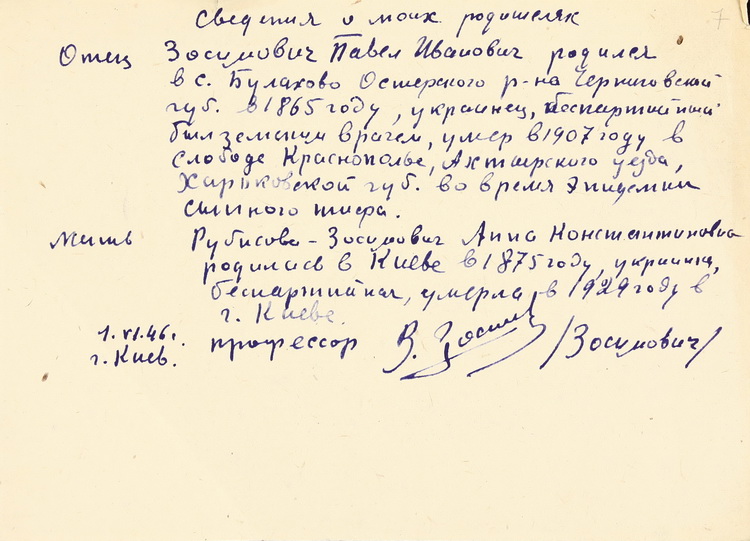 З біографічних відомостей представлено власноручно написану В. П. Зосимовичем інформацію з цікавими фактами про його батьків.