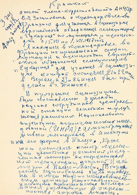 Цікавим є короткий звіт вченого про участь у симпозіумі Європейського об’єднання селекціонерів «Еукарпія» у Франції (1967).