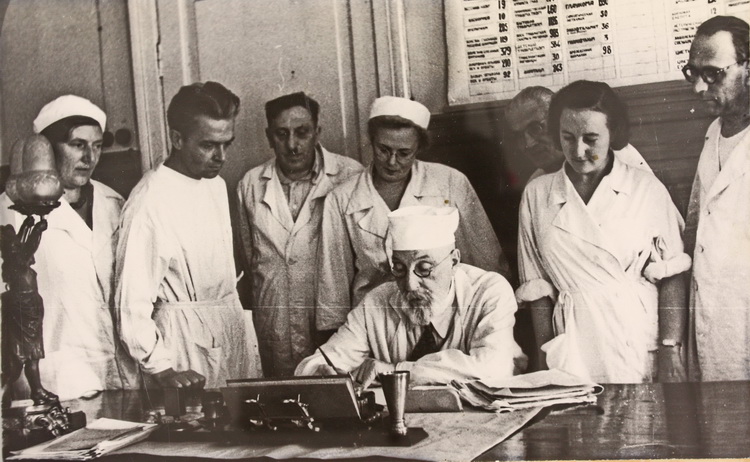 Діяльність В. Філатова як лікаря-офтальмолога і очільника медичних закладів ілюструють фотографії медика серед своїх колег, аспірантів та пацієнтів, яким він допомагав відновити зір. На одному з групових знімків зображено професорку Н. Пучківську.