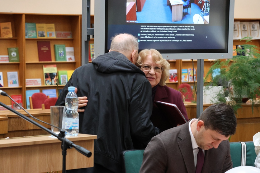Почесний генеральний директор Національної бібліотеки України імені В.І. Вернадського, радник Президії Національної академії наук України, академік НАН України, заслужений діяч науки і техніки України Олексій Семенович Онищенко вручив Любові Андріївні адрес-вітання і грамоту Інформаційно-бібліотечної ради НАН України.