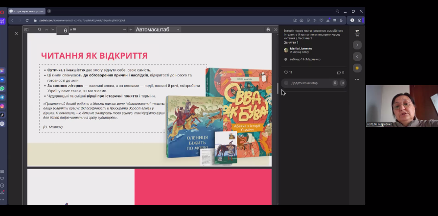 У повідомленні «Формування наукових підходів до історичного читання дітей і підлітків у бібліотечних працівників» Наталія Марченко, старша наукова співробітниця Інституту біографічних досліджень НБУВ, проаналізувала низку заходів із підвищення професійної компетенції бібліотечних працівників за 2022–2025 роки, в яких брала безпосередню участь. У презентації вона продемонструвала синергію досвіду працівників бібліотек, освітян, письменників і видавців, які працюють у галузі книги для дітей і юнацтва, а також наголосила на корисності подібних заходів; поділилася власними враженнями й емоціями; продемонструвала формат обміну інформацією (дошка Padlet).