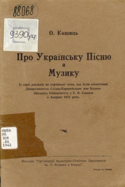 8. Кошиць О. Про українську пісню й музику: із серії докладів на українські теми, що були влаштовані Департаментом Східно-Європейських мов Колюмбійського університету з У. Н. Союзом в Америці 1941 року / О. Кошиць. Вінніпег: Вид. Організації культурно-освітних працівників ім. О. Кошиця в Канаді, 1942. 40 с. Шифр ВЗУ: 9390 укр