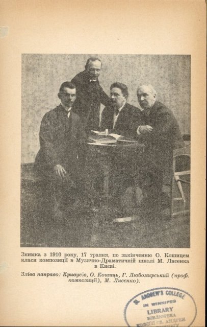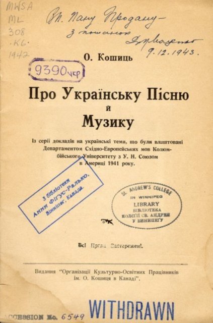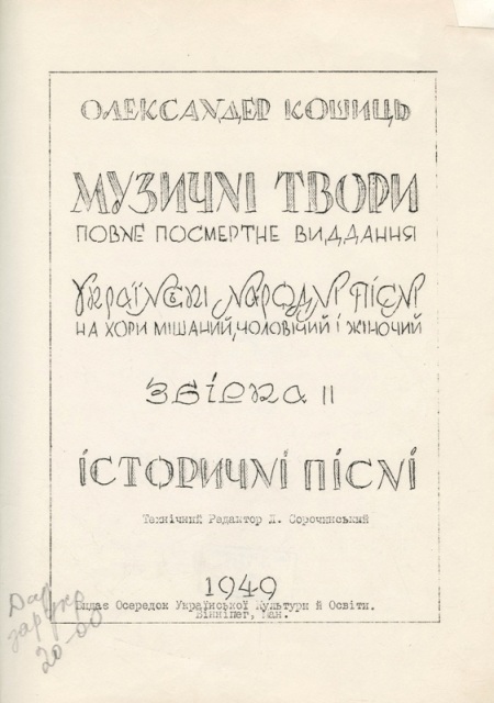 15. Кошиць О. Музичні твори: повне посмертне видання. Українські народні пісні на хори мішаний, чоловічий і жіночий. Збірка II. Історичні пісні. Технічний редактор Л. Сорочинський. Вінніпег; Манчестер: Осередок Української Культури й Освіти, 1949. 32 с. Шифр ВЗУ: 3529 укр