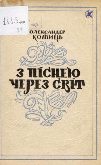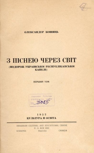 2. Кошиць О. З піснею через світ: (Подорож Української Республіканської Капелі). Т. 1 / О. Кошиць; передм. від вид-ва. Вінніпег: Культура й освіта, 1952 (Друк «Нового шляху»). 196 с. Шифр ВЗУ: 1115 укр