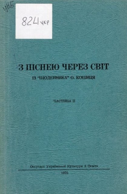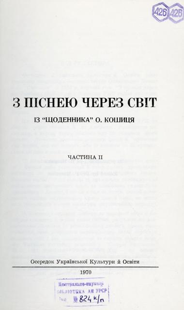 4. Кошиць О. З піснею через світ: Із «Щоденника» О. Кошиця. Ч. 2. / О. Кошиць; П. Маценко (ред.). Вінніпег: Осередок Української Культури й Освіти, 1970. 118 с. Шифр ВЗУ: 824 укр