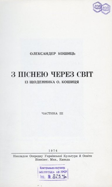 5. Кошиць О. З піснею через світ: Із «Щоденника» О. Кошиця. Ч. 3 / О. Кошиць. Вінніпег, 1974 . 184 с. Шифр ВЗУ: 825 укр