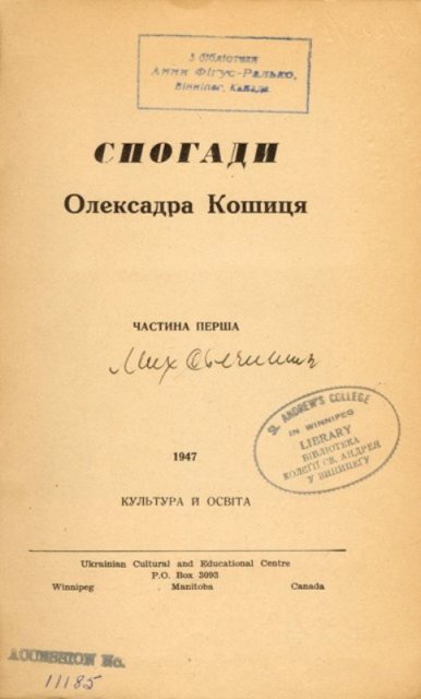 11. Кошиць О. Спогади. Ч. 1 / О. Кошиць. Вініпег: Культура й освіта, 1947. 367 с.: іл. Шифр ВЗУ: 650 укр.