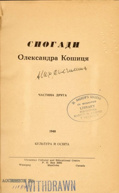 12. Кошиць О. Спогади. Ч. 2 / О. Кошиць. Вінніпег: Культура й освіта, 1948. 272 с.: іл. Шифр ВЗУ: 660 укр