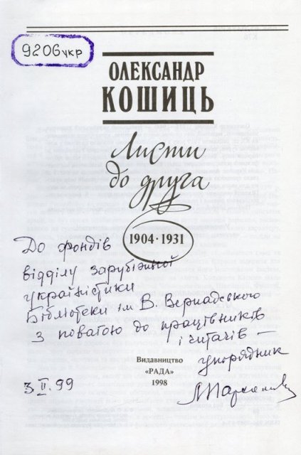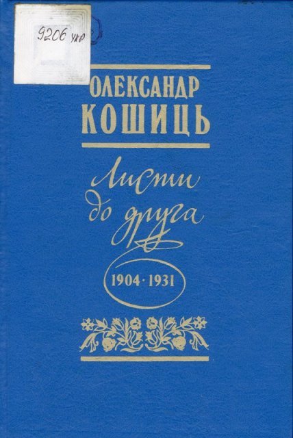 7. Кошиць О. Листи до друга (1904–1931) / О. Кошиць; упоряд., комент., вступ. ст. і покажч. імен Л. Пархоменко. Київ: Рада, 1998. 190 с. Шифр ВЗУ: 9206 укр