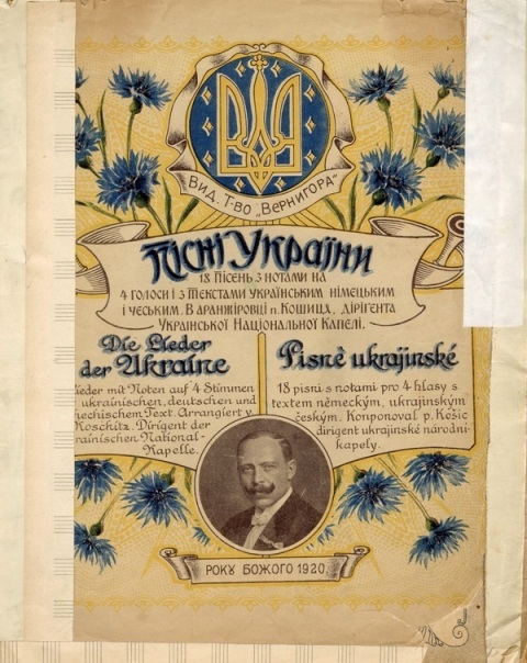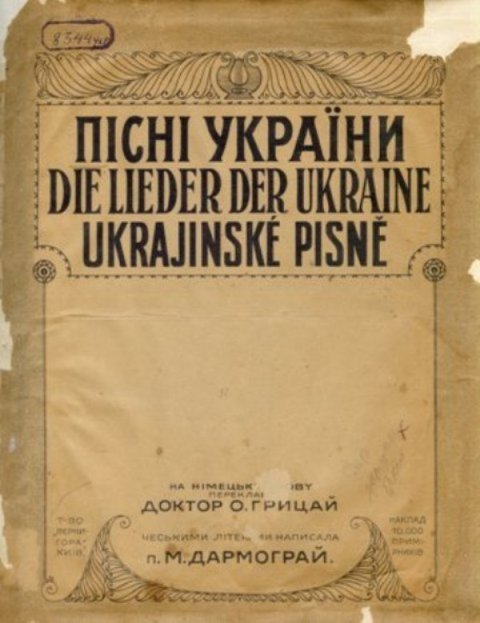 17. Пісні України [Ноти] = Die Lieder der Ukraine = Ukrajinské pisně : 18 пісень з нотами на 4 голоси : [чоловічий хор без супр.] і з текстами українським, німецьким і чеським / аранж. О. Кошиця [На нім. мову переклав О. Грицай; чеськими літерами написала М. Дармограй]. Київ: Т-во «Вернигора», 1920. – 18 с. : іл., портр. 16 с. Шифр ВЗУ: 8344 укр