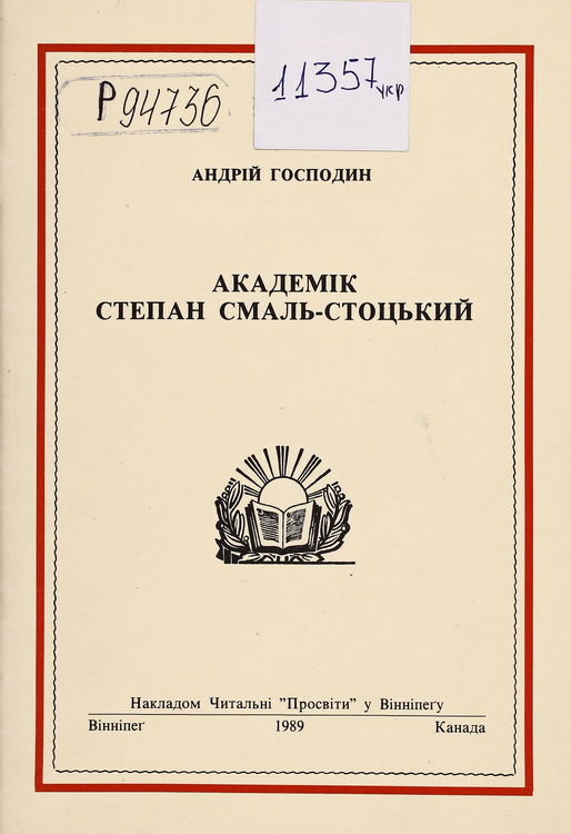 13. Господин А. Академік Степан Смаль-Стоцький / А. Господин. Вінніпег : Читальня "Просвіта", 1989. 36 с. З бібліотеки Анни Фігус-Ралько. Шифр: 11357 укр.