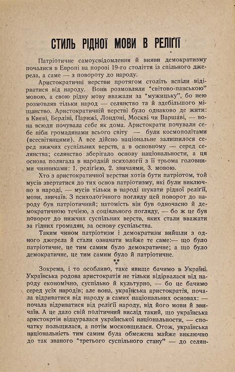 Зі змісту: Бережімо все своє рідне! (Бережімо свої рідні звичаї. Бережімо свою Віру й Церкву. Любімо свій рідний народ. Любімо свою рідну землю. Бережімо свою рідну мову. Бережімо свої рідні пісні. Бережімо свою рідну одежу. Горе зрадникам всього рідного!). – С. 123–129; Творімо українську культуру всіма силами нації! (Ще раз про наші завдання). – С. 130–139; Духовенство й рідна мова. – С. 139–147.