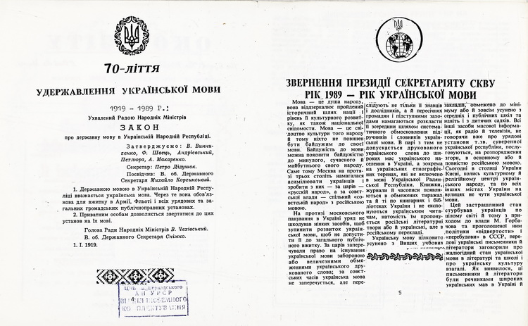 Матеріал для інформування канадсько-українських читачів щодо проекту Закону «Про мову в Українській РСР», який надає надто мало гарантій розвитку української мови в сфері шкільництва, культури, науки (на той час наукова продукція українською мовою становила 4% проти 96% російською мовою).