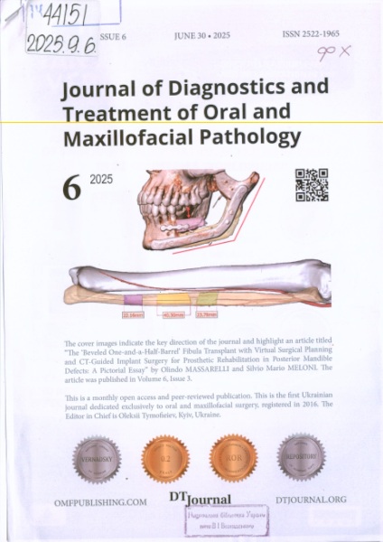 3. JOURNAL OF DIAGNOSTICS AND TREATMENT OF ORAL AND MAXILLOFACIAL PATHOLOGY: journal / Shupyk nat. medical acad. of postgraduate education, [et al.]; ed. board: O. Tymofieiev (ed. in chief) [et al.]. - Kyiv: OFM Publishing, LLC, 2017. - Перевод заглавия: Журнал "Діагностика і лікування оральної та щелепно-лицевої патології". - З січня 2022 р. журнал переведено на цифровий формат видання. - Назва обкл.: DT Journal. - Виходить щомісяця. - Отримується з 2017. - ISSN 2522-1965. - ISSN 2519-2086