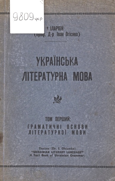 - Іларіон (Огієнко І.). Українська літературна мова. Т. 1. Граматичні основи літературної мови / Іларіон ; передм. авт. – Saskatoon : The Gospel Press, 1951 (Saskaton : Укр. друк., The Gospel Press). – 347 c. Шифр: 9809 укр