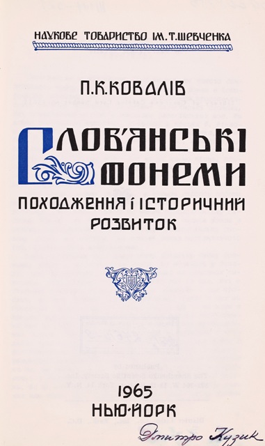 - Ковалів П. К. Слов’янські фонеми : походження і історичний розвиток / П. К. Ковалів ; передм. авт. ; Наук. Т-во ім. Т. Шевченка. – Нью Йорк : НТШ, 1965 (Washington : Lithographed in U. S. A. District Litho. Co). – 256 с. Шифр: 1504 укр, 10528 укр