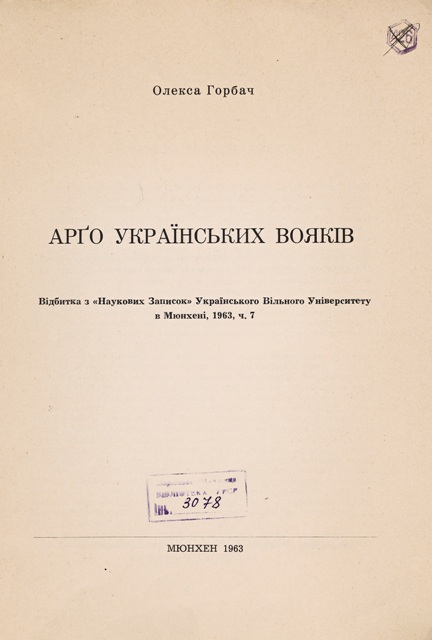 - Горбач О. Арґо українських вояків / О. Горбач. – Мюнхен : УВУ, 1963 (München : Logos, Buchdrukerei u. Verlag). – 34, [1] с. – Відб. з «Наукових Записок» УВУ в Мюнхені, 1963, ч. 7. Шифр: 1304 укр