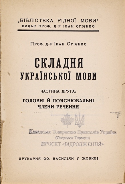- Огієнко І. Складня української мови. Ч. 2. Головні й пояснювальні члени речення / І. Огієнко. – [Жовква] : [б. в.], 1938 (Жовква : Друк. оо. Василіян). – 239 с. – (Б-ка Рідної мови ; ч. 10 : 1933–1938). Шифр: УНД № 159/2