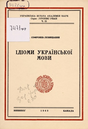 - Ідіоми української мови / зібр. В. Софронів-Левицький ; передм. Я. Рудницький. – Вінніпеґ : УВАН, 1963 (Winnipeg : Printed by the New Pathway Publishers). – 64 с. – (Серія : Літопис УВАН / УВАН ; ч. 21). Шифр: 7471 укр, 9519 укр, 12015 укр, Рудницький Я. Б. № 47