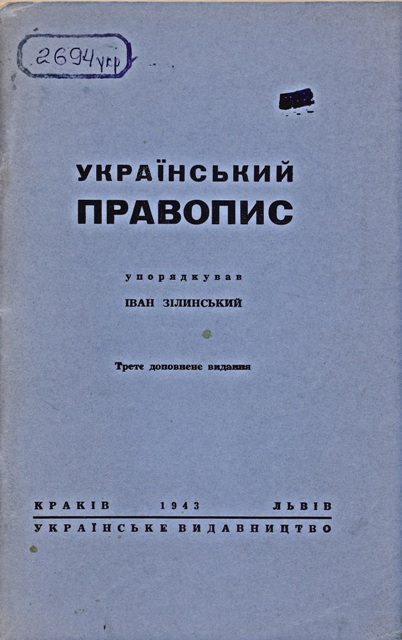 - Український правопис / упоряд. І. Зілинський. – 3-тє доп. вид. – Краків ; Львів : Укр. вид-во, 1943 (Краків : Друк. Поспішної). – 76, [4] с. Шифр: 2694 укр, 1249 укр, 14361 укр