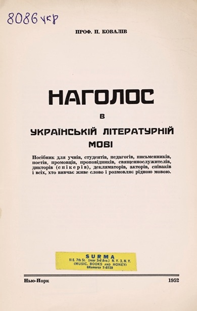 - Ковалів П. Наголос в українській літературній мові : посібник для учнів, студентів, педагогів, письменників, поетів, промовців, проповідників, священнослужителів, дикторів (спікерів), декляматорів, акторів, співаків і всіх, хто вивчає живе слово і розмовляє рідною мовою / П. Ковалів ; передм. авт. – Нью-Йорк : [Сурма], 1952 (Jersey City : Svoboda). – 31, [1] с. Шифр: 8086 укр
