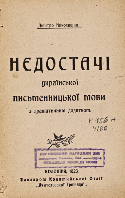 - Николишин Д. Нєдостачі української письменницької мови : з граматичним додатком / Д. Николишин ; перед. сл. авт. – Коломия : Накл. Коломийс. Філії «Учительської Громади», 1923 (Коломия : Друк. А. Кисїлевського). – 146 с. Шифр: УНД № 172