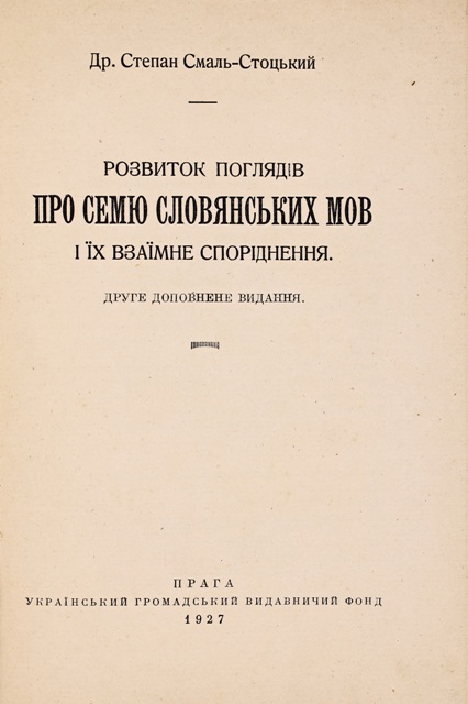 - Смаль-Стоцький С. Розвиток поглядів про семю словянських мов і їх взаїмне споріднення / С. Смаль-Стоцький. – 2-ге доп. вид. – Прага : Укр. Громад. Вид. Фонд, 1927 (Praha : Legiografie). – 90, [2] с. Шифр: 723 укр, 782 укр