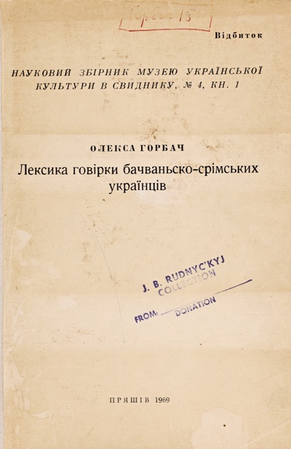 - Горбач О. Лексика говірки бачвансько-срімських українців / О. Горбач. – Пряшів : [б. в.], 1969. – С. 309–350, [1]. – (Наук. зб. Музею укр. культури в Свиднику ; № 4, кн. 1). – Відб. Шифр: Рудницький Я. Б. № 97