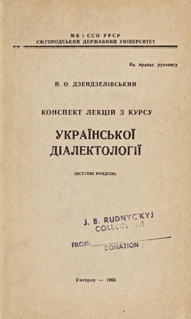 - Дзендзелівський Й. О. Конспект лекцій з курсу української діалектології : (вступні розділи) / Й. О. Дзендзелівський ; МВ і ССО УРСР, Ужгород. держ. ун-т. – Ужгород : [Ужгород. держ. ун-т], 1966 (Ужгород : Закарпат. обл. друк.). – 96 [4] с. : к. – На правах рукопису. Шифр: Рудницький Я. Б. № 72