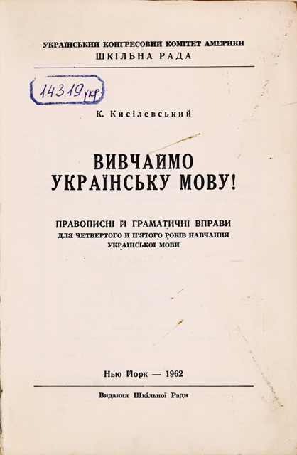 - Кисілевський К. Вивчаймо українську мову : підручник для розмов / К. Кисілевський. – Ню Йорк : Вид. Шкільної ради, 1968. – 31, [1] с. – (Шк. б-ка). Шифр: 4876 укр, 4877 укр