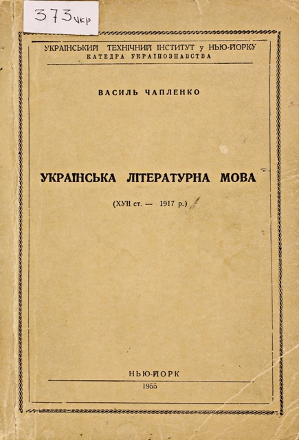 - Чапленко В. Українська літературна мова, її виникнення й розвиток : ХVІІ ст. – 1917 р. / В. Чапленко ; передм. авт. – Нью-Йорк : [б. в.], 1955 (Перт Амбой : Друк. А. Орел). – 328 с. – (Укр. техн. ін-т у Нью-Йорку ; Катедра українознав.). Шифр: 373 укр