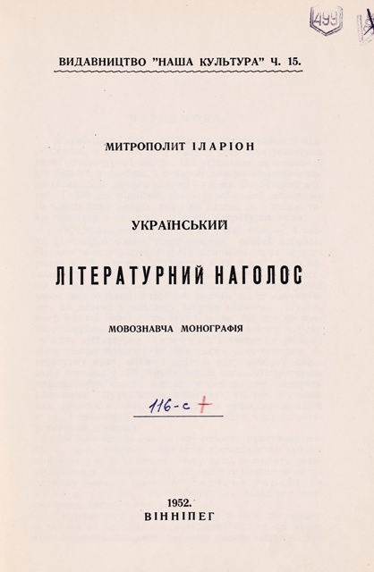 - Іларіон [Огієнко І.]. Історія української літературної мови / Іларіон. – Вінніпег : Наша культура, 1949 (Winnipeg : Printed in Canada by the Christian Press). – 381, [1] с. : іл. – (Вид-во «Наша культура» ; ч. 12). Шифр: 1551 укр, 7033 укр