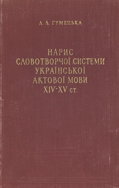 - Гумецька Л. Л. Нарис словотворчої системи української актової мови ХІV – XV ст. / Л. Л. Гумецька. – Київ : Вид-во АН УРСР, 1958 (Київ : Друк. Вид-ва АН УРСР). – 297, [1] с. – (АН УРСР ; Ін-т сусп. наук). Шифр: Рудницький Я. Б. № 70