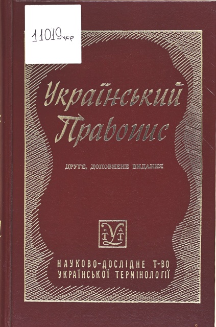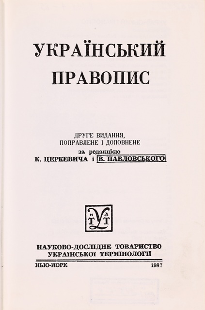- Український правопис / за ред. К. Церкевича і В. Павловського ; упоряд. А. Бойцун, О. Вітошинська, Д. Гуменна [та ін.] ; вступ. сл. від ред. – 2-ге вид., попр. і доп. – Нью-Йорк : Наук.-дослід. т-во укр. термінолоґії, 1987. – ХІІІ, 178 с. : табл. – (Ювілейне вид. «Укр. Правопису» для відзначення 1000-ліття Хрищення Руси-України). Шифр: 11019 укр