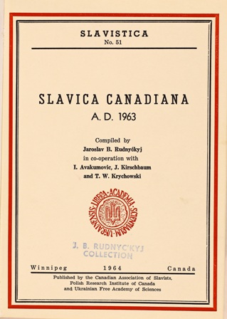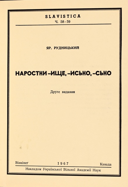 - Rudnyćkyj J. B. Etymological formula with especial reference to Slavic / J. B. Rudnyćkyj. – Winnipeg : Ukr. Free Academy of Sciences, 1962 (Winnipeg : Printed by Trident Press). – 64 p. – (Slavistica : proceedings / Inst. of Slavistics of the Ukr. free academy of sciences ; no. 44). Шифр: 8565/44 (конв. 41–50) укр, Рудницький Я. Б. № 46