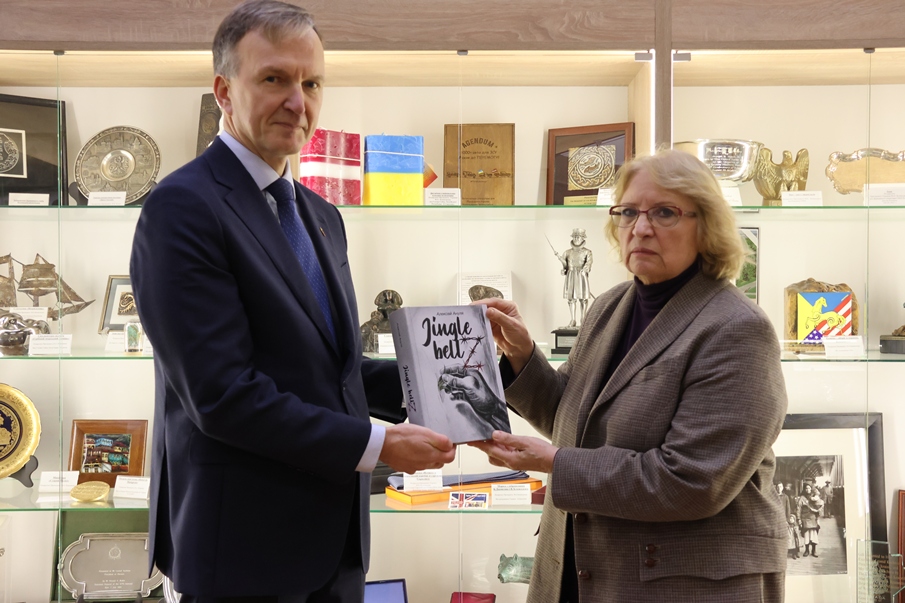 Надзвичайний і Повноважний Посол Латвійської Республіки в Україні Андрейс Пілдеговічс передав генеральному директору НБУВ Любові Дубровіній видану в Латвії книгу Олексія Анулі “Jingle bell(Z)”.