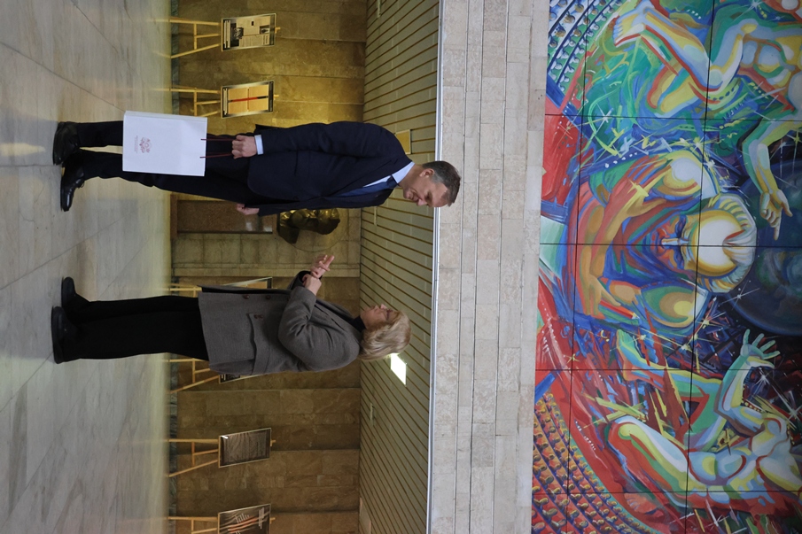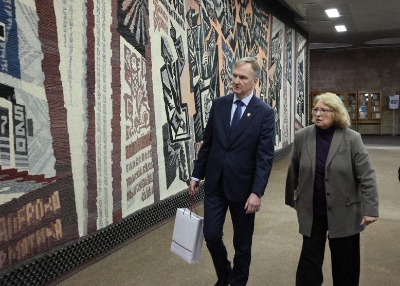 З цікавістю оглянув Андрейс Пілдеговічс хол Бібліотеки і «візитівку» НБУВ – велике монументально-декоративне панно «Біль землі» авторства художників В. Пасивенка та В. Прядка. Відзначив він також архітектурну унікальність пандусу й художню досконалість та просвітницьке значення гобелену-триптиху «Витоки слов’янської писемності», витканого майстрами М. Литовченко та І. Литовченком у техніці ручного ткацтва спеціально для корпусу НБУВ на Голосіївському проспекті. Як відомо, бібліотека імені В.І. Вернадського має найбільшу колекцію фондів зі славістики у світі.